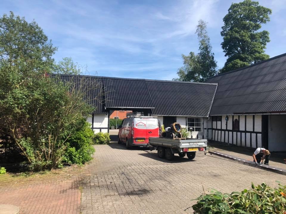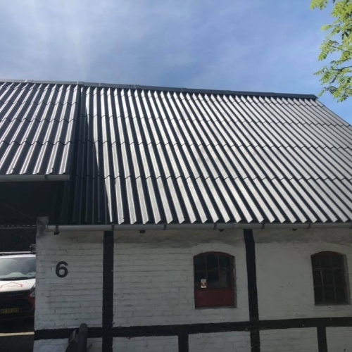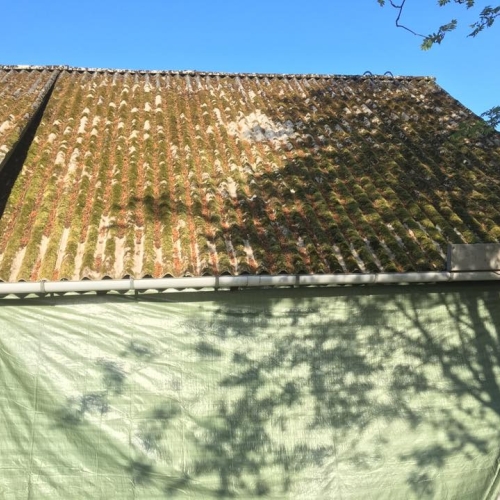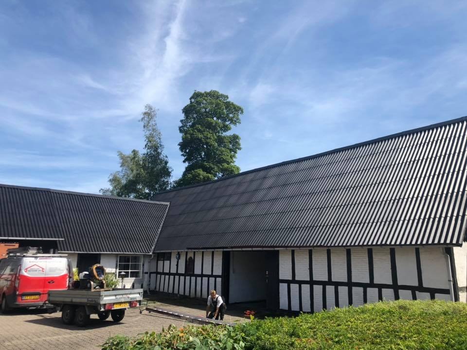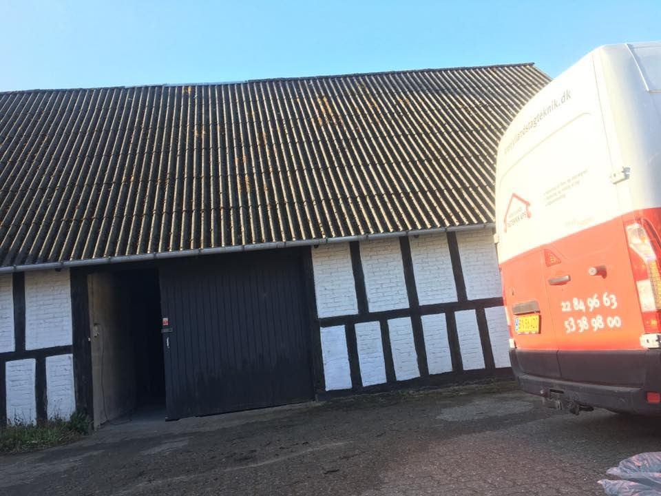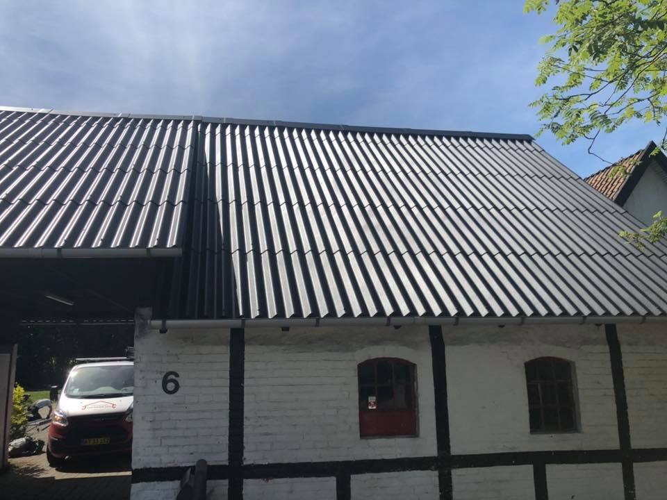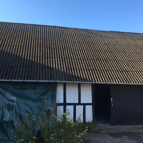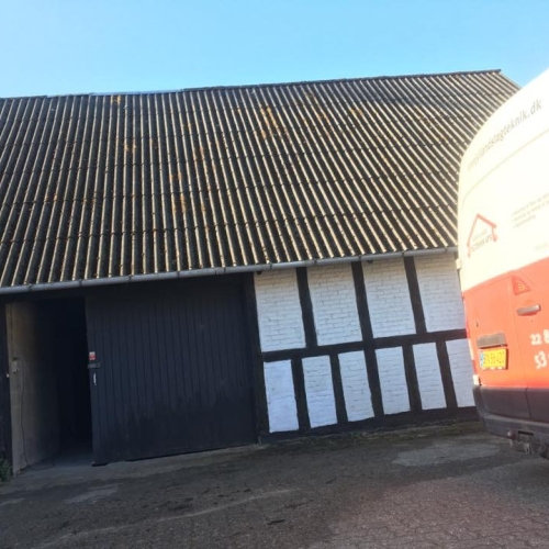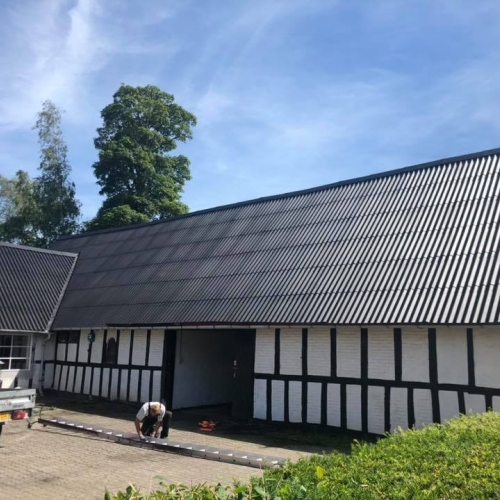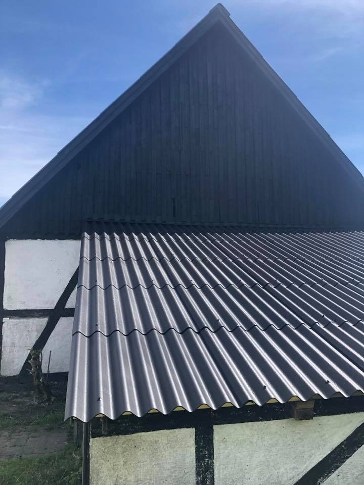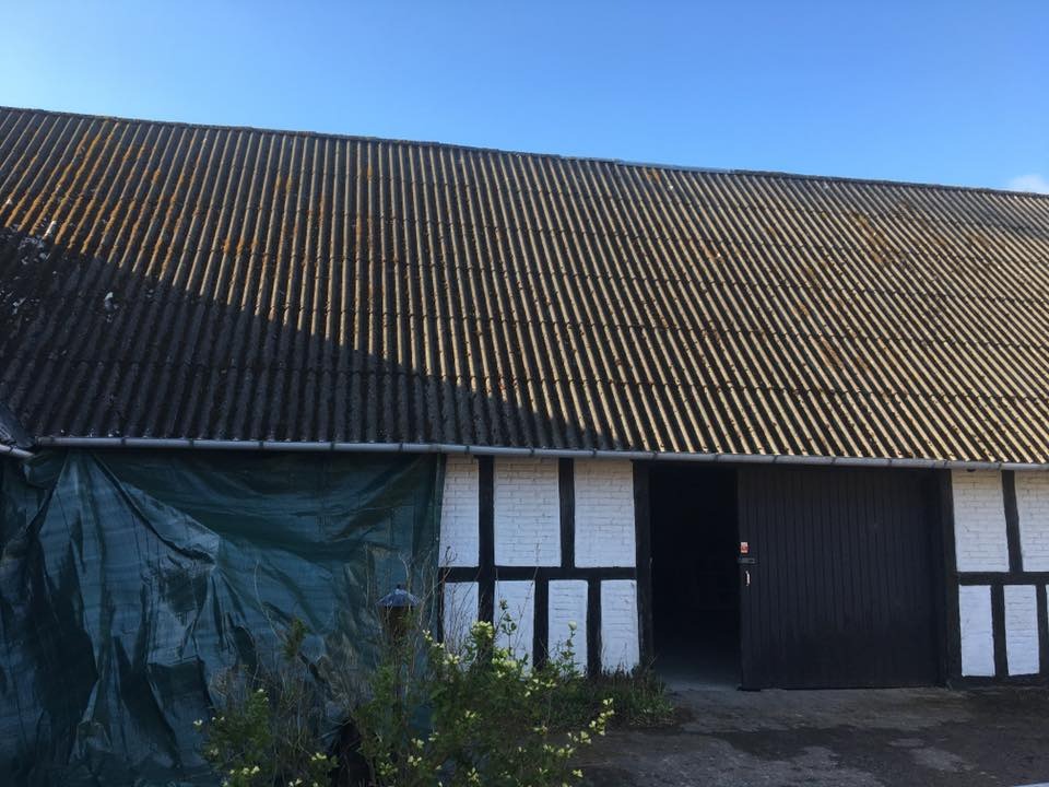 Vi rensede taget med en højtryksrenser for at komme alger, mos og andet snavs til livs hurtigt. Derudover skiftede vi rygningen på taget samt nogle eternitplader. Til slut malede vi taget med: